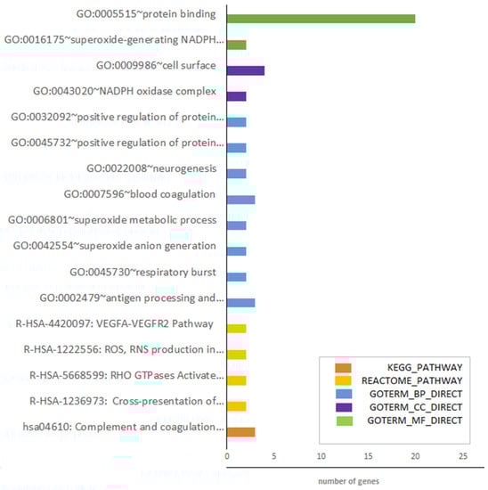 Next, we performed a functional analysis of 29 DEGs identified in the rapeseed oil vs. beef tallow comparison with DAVID software (Table S1). Despite the low number of genes, it revealed that the genes engaged in the hsa04610 KEGG pathway: complement and coagulation cascade were overrepresented (p < 0.004). Moreover, four REACTOME pathways (R-HSA-1236973: cross-presentation of particulate exogenous antigens (phagosomes) (Homo sapiens) p < 0.013; R-HSA-5668599: RHO GTPases activate NADPH oxidases (Homo sapiens) p < 0.021; R-HSA-1222556: ROS, RNS production in phagocytes (Homo sapiens) p < 0.054; and R-HSA-4420097: VEGFA-VEGFR2 pathway (Homo sapiens) p < 0.097 were enriched. Among biological processes, GO:0002479~antigen processing and presentation of exogenous peptide and presentation of exogenous peptide antigen via MHC class I, TAP-dependent, and GO:0045730~respiratory burst were the most significantly enriched processes. Consequently, genes engaged in GO:0043020~NADPH oxidase complex and GO:0016175~superoxide-generating NADPH oxidase activity were overrepresented among the cellular components and molecular functions. All the identified enrichments are presented in Figure 3 and Table S1.