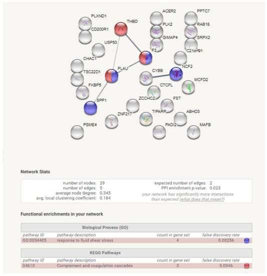 In addition, the functional analysis of genes identified in the rapeseed oil vs. beef tallow comparison (29 genes) by STRING software revealed that they create a significant gene network (PP enrichment = 0.023). Moreover, the genes engaged in fluid shear stress and complement and coagulation cascade were overrepresented (p < 0.00256, p < 0.0346) (Figure 4) after STRING analysis.
