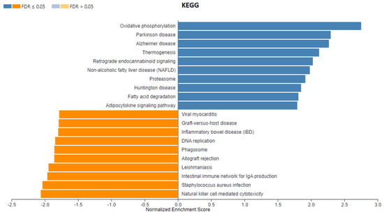 Enriched KEGG pathways (Sus scrofa) identified in the rapeseed oil vs. beef tallow dataset by WebGestalt software. Positive normalized enrichment score indicates that genes from the pathway are at the top of the ranked list (mostly upregulated). Negative normalized enrichment score indicates that genes from the pathway are at the bottom of the ranked list (mostly downregulated) (the first group in the comparison is the reference group).