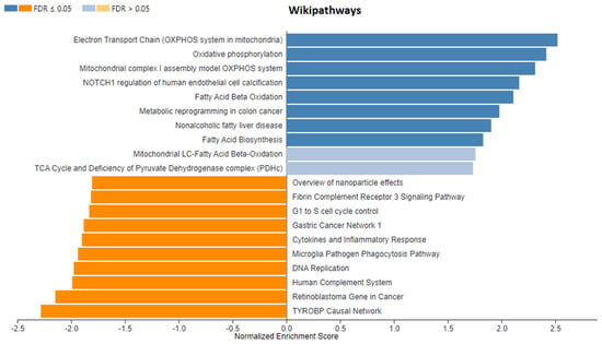 In the dataset from rapeseed oil vs. beef tallow comparison, we observed several pathways connected to neurodegenerative diseases (e.g., Parkinson disease, Alzheimer disease), metabolic diseases (nonalcoholic fatty liver disease) and immunity (phagosome, the intestinal immune network for IgA production) (FDR < 0.05) (Figure 4). Moreover, several Wikipathways (Figure 6) connected to cancer (e.g., metabolic reprogramming in colon cancer, gastric cancer network I) and complement system (FDR < 0.05) were identified in this dataset. Additionally, we observed three enriched biological processes with FDR < 0.05 (generation of precursor metabolites and energy, endocrine process, purine-containing compound metabolic process) (Figure S3 and Table S2). Among cellular components, the respiratory chain with a positive enriched score (FDR < 0.05) as well as the extracellular matrix, sarcolemma, and collagen trimer with a negative enriched score (FDR < 0.05) were identified. Considering the rapeseed oil vs. coconut oil comparison dataset, we observed a high number of overlapping KEGG pathways and Wikipathways with the dataset from rapeseed oil vs. beef tallow comparison (e.g., oxidative phosphorylation, Parkinson disease, Alzheimer`s disease, metabolic reprogramming in colon cancer, TYROBP causal network). Moreover, the same biological processes with a positive score and FDR < 0.05 (generation of precursor metabolites and energy, endocrine process, purine-containing compound metabolic process) were present. Consequently, the same cellular components (respiratory chain, extracellular matrix, sarcolemma, and collagen trimmer) were enriched in these two datasets.