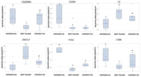 We selected six differentially expressed genes (CD200R1, CD209, CYBB, ZNF217, F3, PLAU) for qPCR analysis with TaqMan assays (Figure 7). Using this method, we observed the same direction of expression changes; moreover, the fold changes in gene expression between dietary groups obtained by RNA-seq and qPCR were highly correlated (R2 = 0.96, p < 0.0004). Scatter plots presenting the between RNA-seq and qPCR for each of the analyzed genes separately are presented in Figure S4. We also observed that the expression of CD209 is significantly lower not only in the coconut oil but also in the beef tallow group compared to the rapeseed oil group, which was undetected by RNA-seq. Furthermore, the expression of the PLAU gene was significantly different not only in the rapeseed oil vs. beef tallow but also in the rapeseed oil vs. coconut oil and beef tallow vs. coconut oil comparisons (Figure 7). Two genes (CD209 and CD200R1) were differentially expressed depending on sex