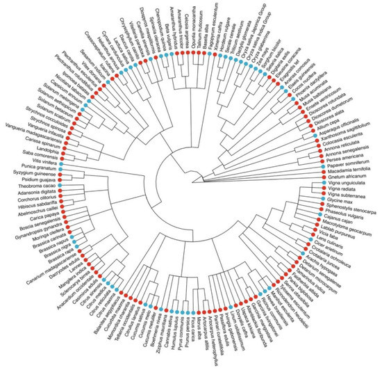 Diversity of currently sequenced, publicly available crop genomes (blue dots) and the orphan crop species initially included in the African Orphan Crops Consortium list (red dots), some of which are available on ORCAE already.