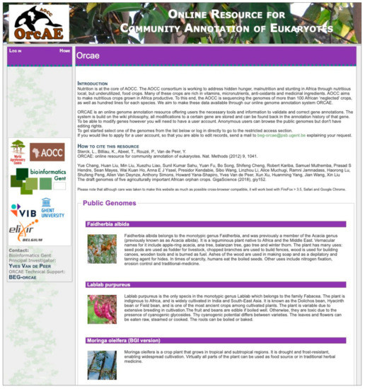 ORCAE (Online Resource for Community Annotation of Eukaryotes) is a public genome annotation curation resource. ORCAE-AOCC is a branch that is dedicated to the genomes published as part of the African Orphan Crops Consortium (AOCC). The motivation behind the development of the ORCAE platform was to create a knowledge-based website where the research-community can make contributions to improve genome annotations. All changes to any given gene-model or gene description are stored, and the entire annotation history can be retrieved. Genomes can either be set to “public” or “restricted” mode; anonymous users can browse public genomes but cannot make any changes. Aside from providing a user- friendly interface to view genome annotations, the platform also includes tools and information (such as gene expression evidence) that enables authorized users to edit and validate genome annotations. The ORCAE-AOCC platform will enable various stakeholders from around the world to coordinate their efforts to annotate and study underutilized crops.