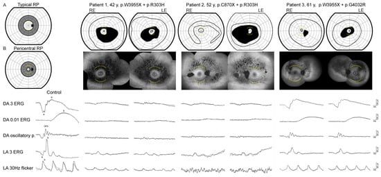 Goldmann visual field (first row) fundus autofluorescence (second row) and full-field ERG (bottom row) of three USH2A patients with double hyperautofluorescent rings. Goldmann perimetry was performed using II/1 and II/4 targets. The arcuate yellow lines mark the 15° radius on Goldmann visual fields and FAF images. RE = right eye, LE = left eye. The figures (A) and (B) mark the approximate location of scotoma associated with “typical” and “pericentral” RP according to Sandberg et al. []. Patients 1 and 2 had absent rod responses and residual cone responses in keeping with the diagnosis of RP. Patient 3 had a mild reduction of the rod (DA 0.01 ERG) and cone (LA 3 ERG and LA 30 Hz flicker) specific responses in a cone-rod dysfunction pattern. The first column shows ERG responses of a representative healthy control.