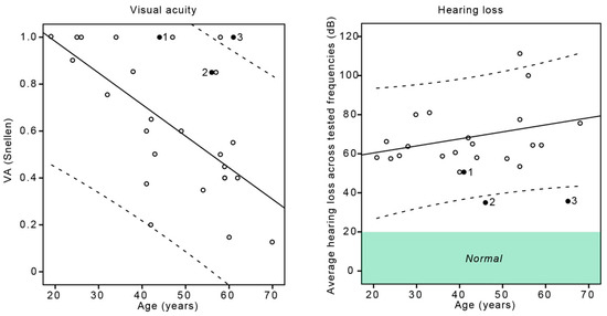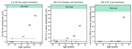 In comparison to the single ring patients, the Patient 3 from the double ring group had significantly delayed the onset of the visual symptoms (58 years) (One-Sample Wilcoxon Signed Rank Test; p < 0.001) whereas Patients 1 and 2 were comparable (onset at 18 and 22 years, respectively). All double ring patients had significantly better light-adapted cone responses and dark-adapted combined rod and cone system responses (Figure 2), with the Patient 3 having the largest amplitudes. The dark-adapted rod response was detectable only in Patient 3 (close to normal) and undetectable in all other patients. Multiple regression analysis showed significant effect of age (B = −0.1; p < 0.01) and FAF pattern (B = −0.42; p < 0.01) on the VA. When plotted against age, the VA of Patient 3 was above the 95% confidence interval of the single ring group and Patients 1 and 2 were on the upper limit (Figure 5). The double ring patients had significantly better hearing than single ring patients (median 36 vs. 64 dB; Mann–Whitney U test, p < 0.01), and when plotted against age, Patients 2 and 3 were outside the 95% confidence interval of the single ring group (Figure 5).
