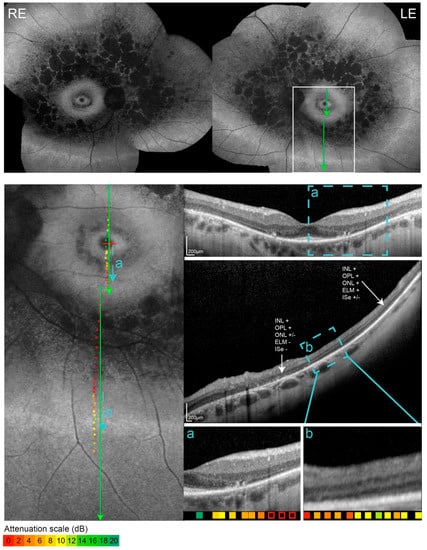 - Robson, A.G.; Egan, C.A.; Luong, V.A.; Bird, A.C.; Holder, G.E.; Fitzke, F.W. Comparison of fundus autofluorescence with photopic and scotopic fine-matrix mapping in patients with retinitis pigmentosa and normal visual acuity. Invest. Ophthalmol. Vis. Sci. 2004, 45, 4119–4125. [Google Scholar] [CrossRef]