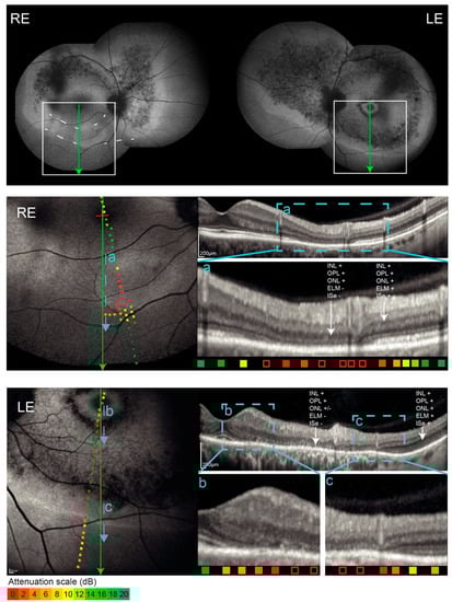 - Murakami, T.; Akimoto, M.; Ooto, S.; Suzuki, T.; Ikeda, H.; Kawagoe, N.; Takahashi, M.; Yoshimura, N. Association between abnormal autofluorescence and photoreceptor disorganization in retinitis pigmentosa. Am. J. Ophthalmol. 2008, 145, 687–694. [Google Scholar] [CrossRef]
