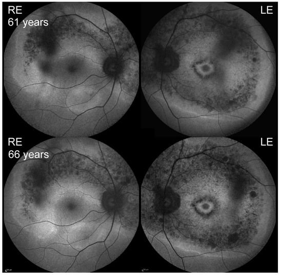 - Popovic, P.; Jarc-Vidmar, M.; Hawlina, M. Abnormal fundus autofluorescence in relation to retinal function in patients with retinitis pigmentosa. Graefes Arch. Clin. Exp. Ophthalmol. 2005, 243, 1018–1027. [Google Scholar] [CrossRef]