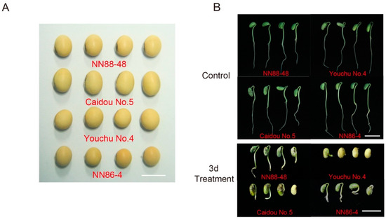 Germination performance of four core lines NN88-48, Caidou No.5, NN86-4 and Youchu No.4. (A) Grain shape of four core lines. (B) The germination and growth of seedlings among selected four lines under control and three days treatment. Scale bars are 1.0 cm in (A) and 3.0 cm in (B).