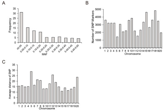 Distribution analysis of 60,109 SNPs across 347 lines. (A) Distribution of minor allele frequency (MAF). (B) Distribution of SNPs on 20 chromosomes. (C) Average distance of SNPs on 20 chromosomes.