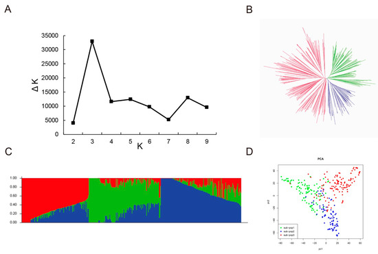 Furthermore, three different methods—Bayesian model-based methods, principal component analysis (PCA) and phylogenetic analysis—were used to determine the population structure of 347 soybean lines of YHSBG population. Delta K (∆K) was calculated using STRUCTURE 2.3.4 (Figure 3A; K = 1–10), and exhibited the presence of three subpopulations (selected K = 3) based on ∆K values (Figure 3C). Furthermore, the phylogenetic tree and PCA analysis displayed the consistent results in agreement with the population structure analysis (Figure 3B,D).