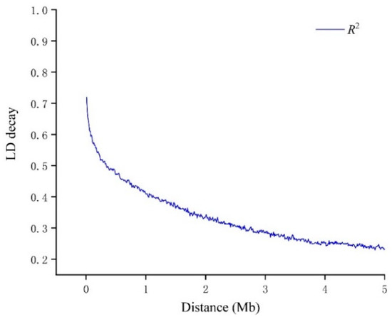 Genome-wide average linkage disequilibrium (LD) decay in the population of 347 soybean lines. The mean LD decay rates were estimated by the squared correlation coefficient (R2).