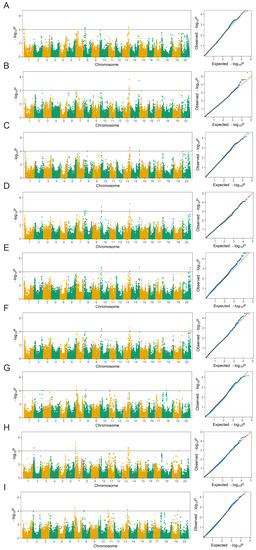 - Yu, J.; Pressoir, G.; Briggs, H.; Vroh, I.; Yamasaki, M.; Doebley, J.; McMullen, M.D.; Gaut, B.S.; Nielsen, D.M.; Holland, J.; et al. A unified mixed-model method for association mapping that accounts for multiple levels of relatedness. Nat. Genet. 2006, 38, 203–208. [Google Scholar] [CrossRef] [PubMed]