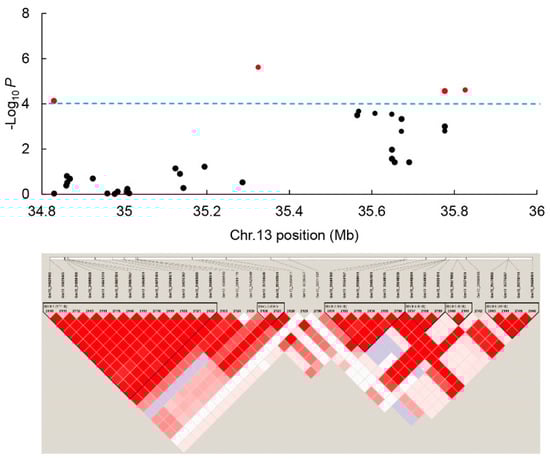 Haplotype blocks and candidate regions of the genome significantly associated with identified major QTNs for GR on Chr.13 in the association population.
