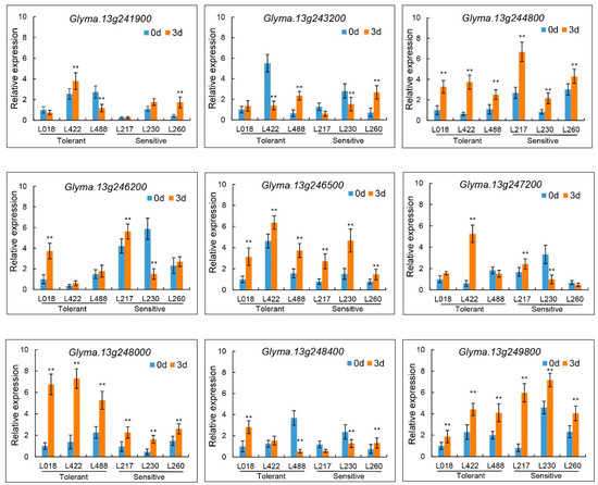 Relative expression levels of nine candidate genes associated with seed-flooding tolerance in tolerant genotypes (L018, L422, and L488) and sensitive genotypes (L217, L230, and L260) under 3 d flooding treatment.
