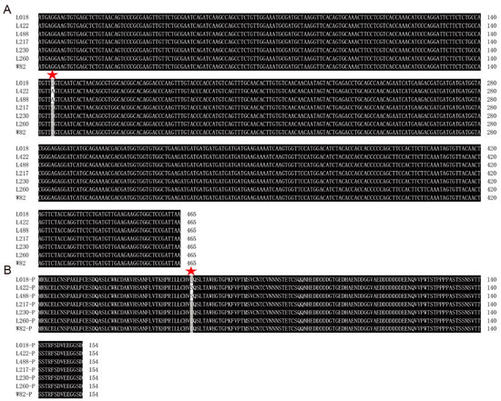 Nucleotide sequence and amino acid sequence alignment of Glyma.13g248000 in seed-flooding tolerant (L018, L422, and L488) and sensitive (L217, L230, and L260) genotypes. (A) The nucleotide sequence alignment. (B) Amino acid sequence alignment. W82 (William82), represents the reference genome of W82 (Glycine max).