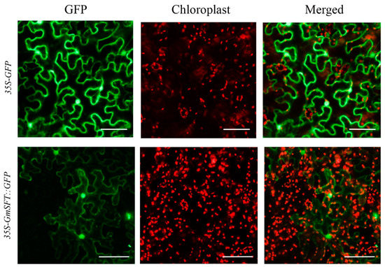 Diagram showing subcellular localization of GmSFT gene in the leaf of N. benthamiana. Bar indicates 50 μm.