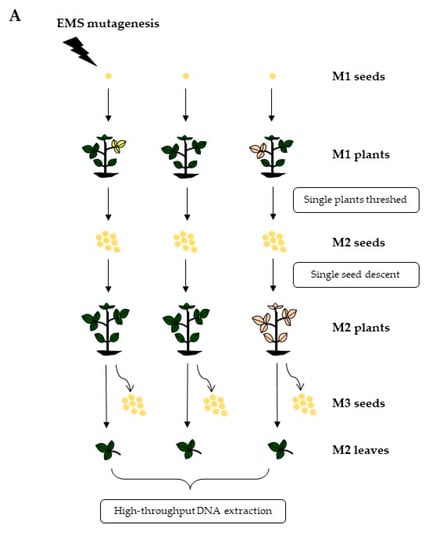 - Espina, M.J.; Ahmed, C.; Bernardini, A.; Adeleke, E.; Yadegari, Z.; Arelli, P.; Pantalone, V.; Taheri, A. Development and phenotypic screening of an ethyl methane sulfonate mutant population in soybean. Front. Plant Sci. 2018, 9, 394. [Google Scholar] [CrossRef]