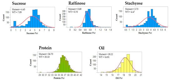 The distribution of seed meal phenotypes in the soybean M3 population. The histograms represent phenotypic variations in five seed meal traits among M3 lines. The means of sucrose, raffinose, stachyose, protein, and oil content are shown for the mutants and wild-type soybeans (WT), respectively. The blue curves indicate the trend of normal distribution.