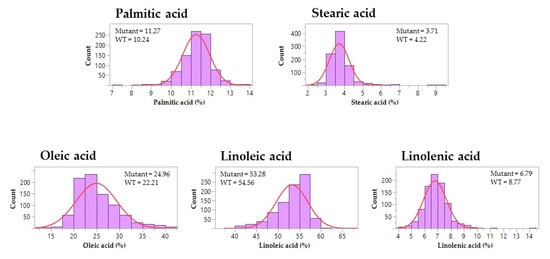The distribution of seed fatty acid phenotypes in the soybean M3 population. The histograms represent phenotypic variations in five fatty acid traits among M3 lines. The means of palmitic acid, stearic acid, oleic acid, linoleic acid, and linolenic acid content are shown for the mutants and wild-type soybeans (WT), respectively. The blue curves indicate the trend of normal distribution.
