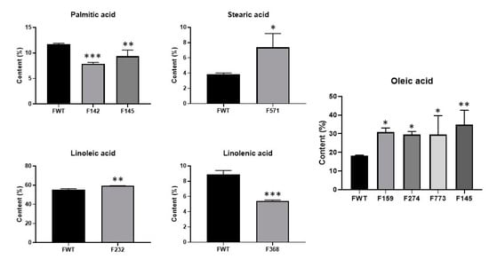 The fatty acid levels of the selected mutant lines in the M4 generation and ‘Forrest’ wild-type (FWT). Multiple pair-wise comparisons were performed on fatty acid contents between mutants and the ‘Forrest’ wild-type using Student’s t test. At least three replicates were tested for each line. Significance level: * p < 0.05, ** p < 0.01, *** p < 0.001.
