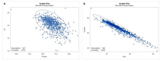 Examples of the scatterplots for correlation analysis in the M3 population. The two scatterplots showing the statistically significant correlations in the soybean M3 population with a 95% prediction ellipse. (A). protein-oil correlation; (B). oleic-linoleic correlation.