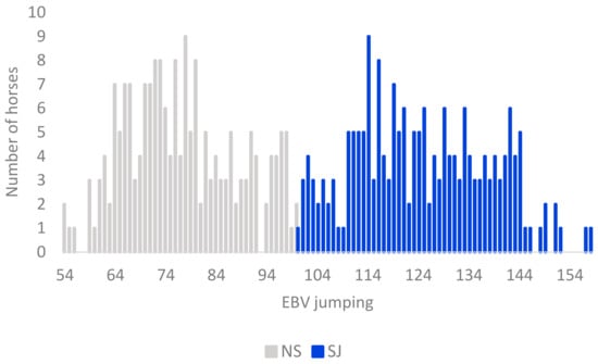 Distribution of estimated breeding values (EBV) for jumping performance in the 380 Swedish Warmblood horses included in this study. The distribution of EBVs for the horses assigned to the subpopulation non-show jumping horses (NS) are shown as grey bars, and, for show jumping horses (SJ), as blue bars.