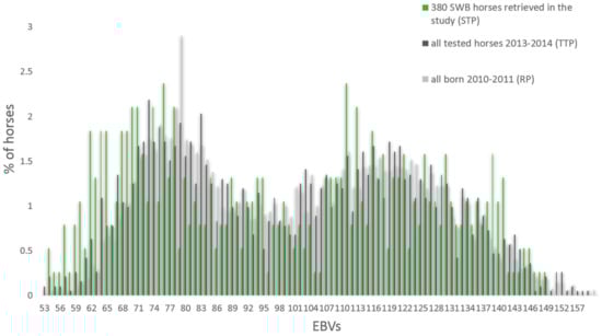 In the SWB studbook, EBVs are available for both showjumping and dressage performance. In the presented study, we used the show jumping EBVs to divide SWB horses in two potentially genetically different groups, for several reasons. The main reasons were the higher heritability [], and faster genetic progress for the show jumping rather than the dressage trait in SWB horses [], but also because horses competing in show jumping are more abundant []. Additionally, jumping performance traits are exclusive in the selection of show jumping horses, while traits related to conformation and gait are, to some extent, selected in both disciplines. For the above-mentioned reasons, we decided to use the EBV for show jumping to divide the sampled horses in two groups. The bimodal distribution of EBVs facilitated this division. Nevertheless, the mean EBVs for dressage was significantly higher in the NS group compared to the SJ horses. Thus, we expect that most of NS horses in the study were bred mainly for dressage performance, confirming the rationale behind the use of EBVs to divide the horses in this study. The horses were selected from the ones assessed at young horse tests in 2013 and 2014, with the aim of including horses with different pedigrees and performance levels. We cannot completely rule out the possibility that preselection may have influenced our results. However, the comparison between means and distributions of EBV in the sample (STP) and in the whole cohort of horses born in the same years (RP) did not show any obvious signs of preselection.