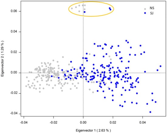 The PCoA revealed some genetic stratification among SWB horses, with 5.2% of the total variance explained by the three main eigenvalues. The first two eigenvalues explained 2.63% and 1.29% of the total genetic variation of the data, as visualized in Figure 3. The SJ horses presented a more scattered cluster based on the second component (eigenvalue 2), indicating higher genetic distance and lower relatedness among individuals compared to the NS horses. Eleven horses, all sired by the same father, clustered as outliers in the PCoA. No offspring from this sire clustered among the other 369 individuals.