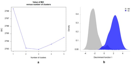 Genetic structure of SWB horses. (a) Inference of the number of clusters in SWB horses from analysis of genotype data based on K–means algorithm; (b) Density plot of individuals along the first discriminant function from the discriminant analysis of principal component (DAPC) for the two defined SWB subpopulations divided by EBVs for show jumping performance. The gray peak represents the non-show jumping horses (NS) and the blue peak represents the show jumping horses (SJ).