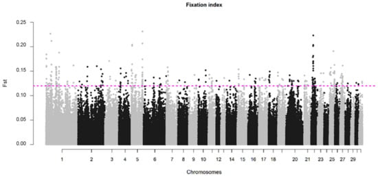Genomic distribution of FST values for SNPs plotted relative to their physical position within each autosomal chromosome. The cutoff to call a SNP as significant was defined as the highest 0.1% of the FST values of the SNPs under analysis and is represented by the SNPs above the dotted pink line (FST ≥ 0.12).