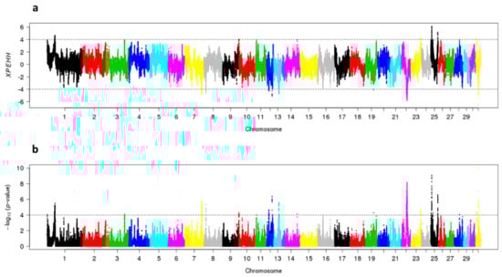 where (XPEHH) is the Gaussian cumulative distribution function. The can be interpreted as a two-sided p-value in a −log10 scale. Negative XPEHH scores indicate that selection happened in SJ horses, while positive values indicate selection in the NS horses []. The False Discovery Rate (FDR) adjustment was performed, applying the Benjamini Hochberg method with FDR equal to 0.05 [].