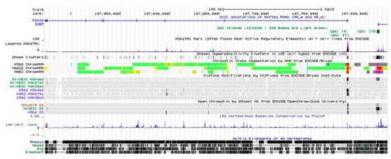 Schematic diagram of genomic organization and chromatin state of the human PDSS2 gene locus. The genomic region of the PDSS2 gene (chr6:107, 441, 132-107, 901, 660, human species genomic assembly version, GRCh37/hg19) is schematically represented with the indicated tracks, including exon-intron structure, H6K27Ac markers, DNase I hypersensitive clusters, histone modifications, and vertebrates conservation. The chromatin state was indicated as active promoter (bright red), strong enhancer (orange), insulator (blue), transcriptional elongation (deep green), and weakly transcribed region (light green).