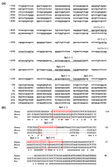 Nucleotide sequence homology analysis of the promoter region of the PDSS2 gene. (a) The nucleotide sequences of putative transcription factor binding sites are underlined. The positions relative to the major PDSS2 transcription start site (+1) are indicated. (b) Sequence alignment of the nucleotide sequences of the PDSS2 gene promoters from human, mouse, and rat species was performed by DNAMAN software. The potential Sp1 binding sites are boxed. The identical bases among human, mouse, and rat species are marked with stars (*).