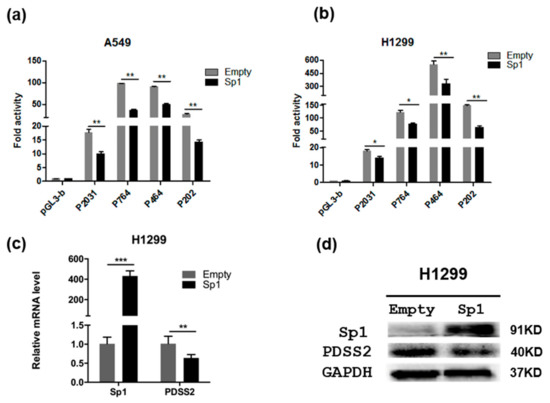 To determine whether Sp1 regulates PDSS2 gene transcription, Sp1 expression plasmid were co-transfected with the indicated PDSS2 luciferase reporter constructs, both in A549 and H1299 cells. The luciferase reporter assay showed that overexpression of Sp1 significantly inhibited the luciferase activity of all of the four reporter constructs with various degrees when compared with the empty vector transfected group (Figure 4a,b). In fact, multiple typical Sp1 binding sites existed in all of the four selective PDSS2 promoter fragments (Figure 3). Next, we further determined whether Sp1 represses the endogenous transcription of PDSS2 in cells. As shown in Figure 4c,d, exogenous overexpression of Sp1 resulted in significant repression of the endogenous PDSS2 expression, both at mRNA and protein levels. Therefore, these results clearly indicate that Sp1 represses the expression of the PDSS2 gene.