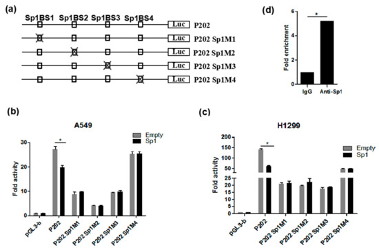 To further verify the functional involvement of Sp1 binding sites in the PDSS2 core promoter region, point mutations were introduced to disrupt each of the four putative Sp1 binding sites of the PDSS2 core promoter, respectively. The corresponding luciferase reporter constructs were designated as P202M1, P202M2, P202M3, and P202M4, respectively (Figure 5a). As shown in Figure 5b,c, disruption of each of the four Sp1 binding sites—especially the first three sites—resulted in significant decreased PDSS2 core promoter activity in both H1299 and A549 cells. Intriguingly, disruption of the fourth Sp1 binding site (Sp1BS4) led to significant repressed promoter activity in H1299 but not A549 cells, suggesting a cell type-dependent mechanism. Of note, disruption of each of the four Sp1 binding sites completely abolished the inhibitory effect of Sp1 overexpression on PDSS2 promoter activity. Therefore, these results strongly suggest that all the four Sp1 binding sites in the PDSS2 core promoter region are not only critical for its constitutive core promoter activity, but also essential for Sp1-mediated repression of PDSS2 transcription. In addition, Chromatin immunoprecipitation (ChIP) assay demonstrated that Sp1 binds to the PDSS2 core promoter region in vivo in cells (Figure 5d), suggesting that Sp1 is a bona fide direct regulator for the human PDSS2 gene.