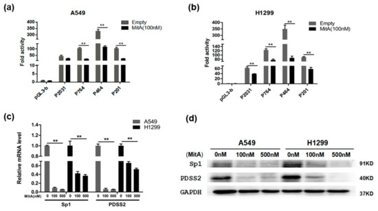 To further investigate the role of Sp1 in regulating the constitutive expression of the PDSS2 gene, we chose to utilize a selective Sp1 inhibitor to execute a loss of function experiment of Sp1. As a selective inhibitor, mithramycin A (MitA) is known to bind to GC-rich DNA sequences, displacing Sp1 transcription factor binding to its target promoters, which inhibits their expression [15]. As shown in Figure 6a,b, luciferase reporter assays revealed that MitA treatment resulted in significant decreased promoter activity of the PDSS2 promoter reporters in A549 and H1299 cells. Furthermore, MitA treatment also led to remarkable repression of endogenous PDSS2 expression at both mRNA and protein levels in both A549 and H1299 cells (Figure 6c,d). These results are consistent with the observation of decreased promoter activity caused by disruption of Sp1 binding sites in the PDSS2 core promoter region (Figure 5a–c), highly suggesting that Sp1 is an essential transcriptional regulator for the basic constitutive expression of the PDSS2 gene in cells.
