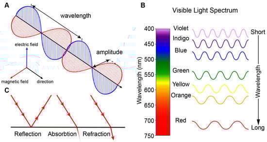 Transmission of light. (A) Light is electromagnetic radiation that travels as waves consisting of perpendicular oscillating electric and magnetic fields. (B) Visible light is a narrow group of wavelengths between approximately 400 nm (short wavelength) and 760 nm (long wavelength) which we interpret as a spectrum of different colors. Wavelengths outside this range are not visible to humans. (C) Light can be reflected, absorbed and refracted.