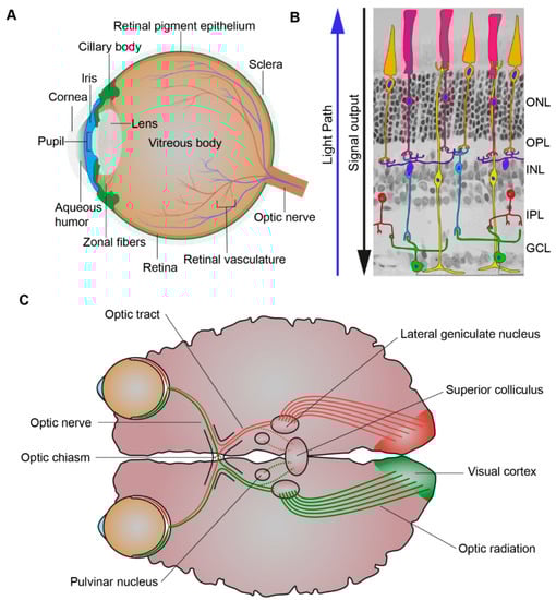 When light first enters the eye, it is refracted by the cornea through the pupil, whose size is controlled by the iris. The iris, the colored part of the eye, controls the amount of light entering the eye while the lens focuses the light through the vitreous humor and on to the proximal surface of the retina (Figure 2A). The adult retina consists of one glial cell type, the Müller glial cells, and six major types of neurons, the rod and cone photoreceptors, bipolar cells, amacrine cells, horizontal cells, and ganglion cells (Figure 2B). Their cell bodies are distributed across three nuclear layers, the outer nuclear layer (ONL), inner nuclear layer (INL), and ganglion cell layer (GCL). Two synaptic layers, the outer plexiform layer (OPL) and inner plexiform layer (IPL), contain the axonal and dendritic processes of the cells []. Whereas there is one type of rod photoreceptor, there are various subtypes of cone photoreceptor, bipolar, amacrine, horizontal, and ganglion cells that differ in their functional roles and morphology []. Besides Müller glial cells there are two other glial cell types that serve to maintain retinal homeostasis, the astrocytes and resident microglia []. Light must be channelled through the retina and absorbed by its three light responsive cells: the rod and cone photoreceptors and the intrinsically-photosensitive retinal ganglion cells (ipRGCs). The mammalian retina contains various opsin proteins involved in the photoreception synchronisation of circadian rhythms (photoentrainment). These are the cone opsins (M/LWS, red/green opsin; SWS1, blue opsin) responsible for high visual acuity, resolution, and color vision (photopic vision), and rod opsin (RH1, Rhodopsin) responsible for dim light vision (scotopic vision) and ipRGCs opsin (OPN4, Melanopsin) responsible for synchronisation of the circadian rhythms and ambient light perception [,,,]. The cones are less sensitive to light and rods are more sensitive to light and are also used together under intermediated light conditions (mesopic vision) []. Most forms of inherited retinal disease negatively affect the function of photoreceptors, resulting in progressive loss of rod and/or cone photoreceptors. Müller glial cells mediate the channelling of light through the retina towards the photoreceptors [,]. Müller glial cells can channel different wavelengths of light to specific subsets of photoreceptors to optimise day vision []. The visual pigments of the photoreceptors contain an opsin protein covalently linked to the chromophore 11-cis-retinal. Upon the absorption of a photon 11-cis-retinal becomes isomerised to all-trans-retinal, this leads to an activated opsin intermediate (metarhodopsin II, rods; Meta-II, cones). This active intermediate leads to triggering of a transduction cascade resulting in hyperpolarisation of the photoreceptors, due to the closure of cyclic guanosine 3′,5′-monophosphate (cGMP)-gated channels, and a reduction in glutamate release []. This electrophysiological signal is then further propagated to the inner retina and can be propagated through many different pathways to the ganglion cells. Prototypically these signals can be direct, from photoreceptor (PRC) to bipolar cells to ganglion cells. However, it can also be indirect with lateral modulation of the electrophysiological signals being made by horizontal cell processes in the OPL or by amacrine cell processes in the IPL [,,]. Thus, creating radially aligned “functional units” of photoreceptors, bipolar cells, amacrine cells, horizontal cells, and ganglion cells. The fovea contains a specialised pathway, termed the midget pathway, which helps account for its ability to provide high visual acuity [,,].