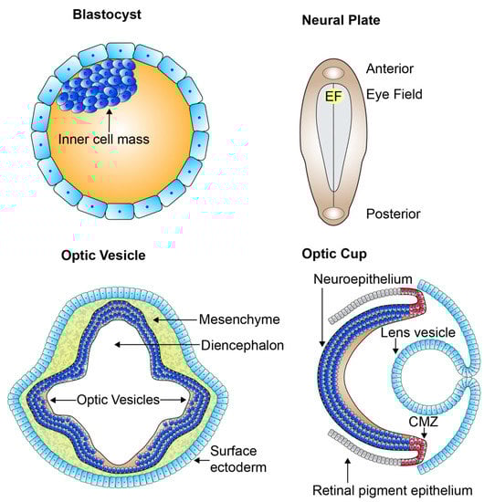 The organization of the developing retina. Schematic picture of early retinal development. From the blastocyst which contains the pluripotent cell mass gastrulation and neurulation occur forming the neural plate. The eye field specifies at the medial region of the anterior neural plate and contains all the progenitors which go on to form all the neural-derived cell types and structures of the eye. Bilateral optic sulci develop from the eye field forming the optic vesicles which extend towards the surface ectoderm. The optic vesicles invaginate forming the two-layered optic cups and the lens vesicle forms and sits behind the surface ectoderm. The outer layer of the optic cup remains as a single cuboidal layer becoming the retinal pigment epithelium. The single inner layer of the optic cup proliferates and differentiates forming the multilayered neural retina. EF: eye field; CMZ: ciliary marginal zone.