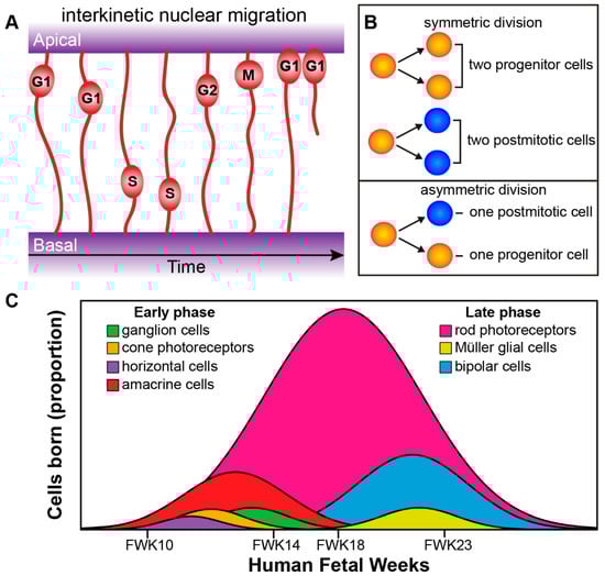 Retinogenesis. (A) Radial progenitor cells undergoing interkinetic nuclear migration during cell cycle phases G1, S, G2, and M. The mitosis (M) phase takes place at the apical side, whereas the DNA synthesis (S) phase takes place more basally. (B) Symmetric versus asymmetric cell division. (C) Genesis of retinal cells born during the development of the human eye can be divided into an early phase (ganglion cells, cone photoreceptors, horizontal cells, and amacrine cells) and an overlapping late phase (rod photoreceptors, Müller glial cells, and bipolar cells; see Aldiri et al. 2017 []). FWK—fetal week.
