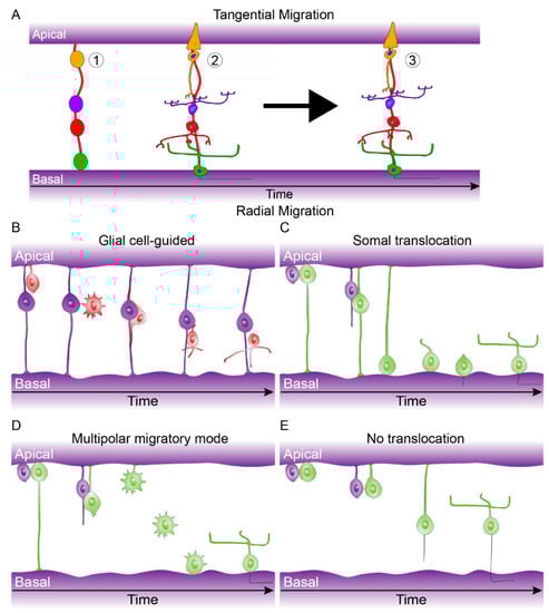 There are a number of modes of radial migration for newborn neurons including: glial cell-guided, the migration of neurons along radial glial progenitors (Figure 5B); Somal translocation, the movement of nuclei across inherited apical or basal processes (Figure 5C); Multipolar migratory mode, nuclei movement due to multiple cell processes with no retention of apical or basal attachment to facilitate nuclei movement (Figure 5D); No translocation, inefficient migration due to retention of the apical or basal process and slow release of opposing process (Figure 5E). These various modes of migration are cell type-specific [,,,]. Tangential dispersion is driven by a mix of diffusible signals and/or contact-mediated interactions that drive a local spacing rule to keep a minimum distance between neighboring cells of the same cell type [].