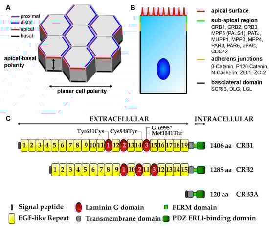 Apical-basal cell polarity is pivotal for the formation and functionality of epithelial tissues being governed by conserved canonical factors that define the apical domains. Apical polarity factors are for example the Crumbs-homologues (CRB1 and CRB2), Protein associated with Lin Seven 1 (PALS1 also called MAGUK p55 subfamily member 5 or MPP5), Partitioning defective-6 homolog (PAR6), atypical protein kinase C (aPKC), and PAR3. Basolateral polarity factors are for example Protein scribble homolog (SCRIB), Discs large homolog (DLG), and Lethal giant larvae protein homolog (LGL). However, recent work in the fruit fly Drosophila mid gut indicates that there are alternative apical polarizing factors other than the canonical epithelia polarity factors and that this may also extend to some types of vertebrate epithelia []. Additionally, there also exists planar cell polarity (PCP) in tissue epithelia, which is orthogonal to the apical-basal axis (Figure 6A) []. The retinal sub-apically localized CRB and PAR complexes (Figure 6B) are pivotal in maintaining the spatiotemporal processes of retinogenesis. The CRB complex has a prominent role in the control of apical-basal polarity acting as a sensor for cell density and upon polarization leading to regulation of Adherens Junctions (AJs) to promote maintenance of cell adhesion [,]. Disruption of the CRB complex leads to loss of polarity and can lead to subsequent loss of adhesion, ectopic localization of progenitors and postmitotic cells due to disrupted apically anchored process and coordinated cell migration, increase in cycling progenitor cells and late-born cell types, increase in early retinal apoptosis, and disruption of lamination. A long-term consequence of loss of retinal apical polarity is mild to severe retinal degeneration with a concurrent loss of retinal function in line with morphological deficit [,,,,,]. The complex acts in the role of conductor coordinating multiple downstream signaling pathways which have essential roles in development, such as the Notch and Hippo pathways [,,]. Thus, leading to the regulation of cell size, cell fate determination, cell self-renewal, proliferation, differentiation, mitosis, and apoptosis. However, how these intertwined cellular responses are mediated collectively by the core complex remains ambiguous.