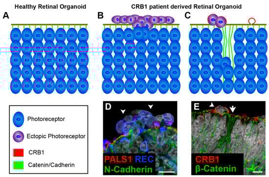 Disruptions at the outer limiting membrane in retinal organoids from CRB1 retinitis pigmentosa (RP) patients. Schematic depiction of healthy (A) and CRB1 patient (B,C) derived retinal organoids. (A) In healthy organoids CRB1 is located at the subapical region adjacent to the adherens junctions. (B,D) In retinal organoids from CRB1 retinitis pigmentosa patient (LUMC0116iCRB) disruptions of the outer limiting membrane (OLM) and ectopic photoreceptors have been found. (C,E) Additionally, budding of the apical membrane and mislocalization of the CRB1 variant in the NBL also occurs. Scale bars (D,E), 20 µm. Panels (C,D) are modified from [] under a Creative Commons license.