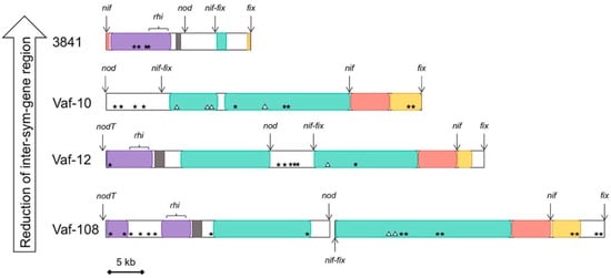 In addition to full-size sym genes, the small (150–200 bp) fragments of nifH (in strains Vaf-10 and Vaf-12), fixP (in Vaf-10 and Vaf-108), and fixG (in Vaf-10 and Vaf-108) were identified in the intergenic regions (Figure 3). Analysis of their similarity to the full-size homologs within the same genome revealed 5%–15% nucleotide substitutions.
