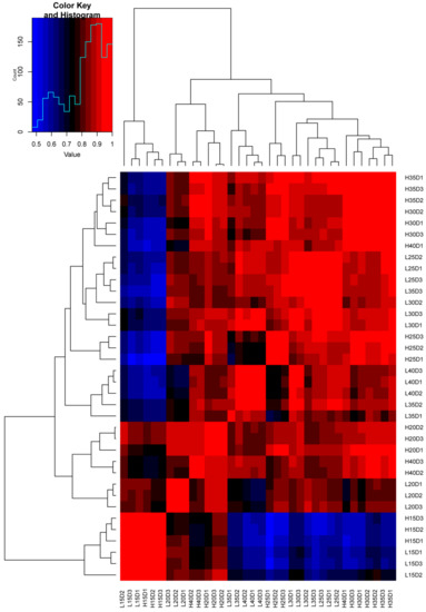 Heat map showing the clustering of differentially expressed genes (DEGs) among different biological replicates at different stages of embryo development. L15D1 represent replicate 1 of low oil maize at 15 days after pollination, and so on. H15D1 represent replicate 1 of high oil maize at 15 days after pollination, and so on. Blue color indicates low expression and red color indicates high expression.