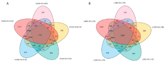 Venn diagram showing genes expressed in each of the five stages of maize in comparison with 15 days after pollination (DAP) in HOC and LOC maize. (A) Number of genes expressed between a particular developmental stage compared with 15 DAP and co-expressed genes between different developmental stages in HOC maize. H15D represent developmental stage of 15 days after pollination (DAP) in HOC maize, and so on. (B) Number of genes expressed at particular developmental stage in comparison with 15 DAP and co-expressed genes between different developmental stages in LOC maize. L15D represents developmental stages of 15 DAP in LOC maize, and so on. HOC; high oil-content maize, LOC; low oil-content maize.