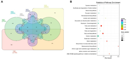 Furthermore, we compared the DEGs between HOC and LOC at all developmental stages. We obtained 739 core DEGs that are constantly differentially expressed between HOC and LOC maize at all stages (Figure 4A), which may represent the key genes related to the differential oil accumulation among HOC and LOC (Table S4). KEGG pathway enrichment analysis for these 739 core DEGs showed that they mainly contributed to the pathways related to oil metabolism (fatty acid metabolism, fatty acid biosynthesis, biosynthesis of unsaturated fatty acids, carbon metabolism, biotin metabolism), which further indicated that these are the key pathways and DEGs involved in oil accumulation in maize seed embryo (Figure 4B).