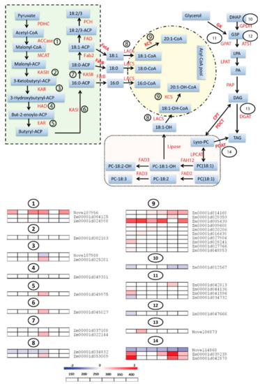 Temporal expression pattern for the genes involved in fatty acid and triacylglycerols (TAG) biosynthesis pathway in maize. The 33 DEGs encoding these enzymes identified from functional unigenes annotation were used to produce the schematic diagram. The DEGs encoding enzymes at each step in the pathway are listed at the bottom of pathway opposite to the number in the circle. The expression pattern of DEGs at 15, 20, 25, 30, 35 and 40 DAP is represented by heatmap. Red (upregulation), blue (downregulation) and white (no significant difference) as indicated in color scale at the bottom of figure. The identified key enzymes involved in lipid metabolism include acetyl-CoA carboxylase carboxyl transferase, (ACCase, EC:6.4.1.2); Malonyl-CoA-ACP transacylase, (MCAT, EC:2.3.1.39); 3-Ketoacyl ACP synthase III, (KAS III, EC: 2.3.1.180); 3-Ketoacyl ACP reductase, (KAR, EC:1.1.1.100); 3R-hydroxymyristoyl ACP dehydrase, (HAD, EC:4.2.1.-); enoyl-ACPreductaseI, (EAR, EC:1.3.1.9); 3-Ketoacyl ACP synthase I, (KASI, EC: 2.3.1.180); 3-Ketoacyl ACP synthase II, (KASII, EC: 2.3.1.180); fatty acyl-ACP thioesterase A, (FatA, EC:3.1.2.14); fatty acyl-ACP thioesterase B, (FatB, EC:3.1.2.14 3.1.2.21); long-chain acyl-CoA synthetases (LACS); 3-ketoacyl-CoA synthase (KCS); glycerol kinase, (GK, EC:2.7.1.30); glycerol-3-phosphate acyltransferase, (ATS1/GPAT, EC:2.3.1.15); lysophosphatidyl acyltransferase, (LPAT, EC:2.3.1.51); phosphatidate phosphatase, (PAP, EC:3.1.3.4); diacylglycerol O-acyltransferase 1, (DGAT1, EC:2.3.1.20); phospholipid: diacylglycerol acyltransferase, (PDAT, EC:2.3.1.158); lysophosphatidylcholine acyltransferase.