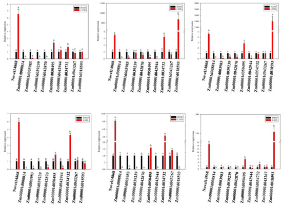 Validation of RNA-seq data by qRT-PCR using 10 differentially expressed genes between high and low oil maize. Values are mean ± SE of three biological replicates. Letters a and b represent statistical significant difference at p < 0.05.
